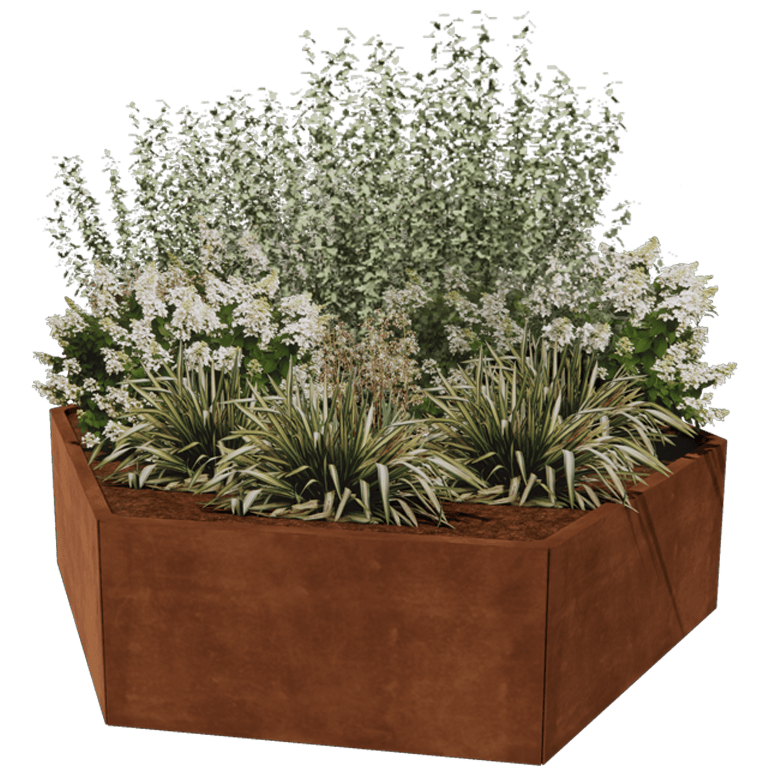 Modulaaristen kasvilavojemme paneelit valmistetaan korkealaatuisesta Corten-A teräksestä. Tällä metallityypillä on ainutlaatuinen ominaisuus, että se muodostaa erittäin tiheän oksidikerroksen (ruostekerros) pinnalleen. Ruostuminen on näin ollen mahdotonta. Tiheä oksidikerros suojaa syvemmällä olevaa materiaalia hapelta, mikä hidastaa oksidaatiota merkittävästi, vaikka korroosio jatkuu. Corten-teräksinen kasvilava toimitetaan ruostumattomana, harmaan metallivärisenä. Ruostumisprosessi alkaa viikkojen tai 2 kuukauden kuluttua, eikä käsittelyä tarvita. Ruostumisprosessin aikana kasvilava saattaa päästää väriä. Corten-teräs on metalliseos, joka koostuu raudasta, johon on lisätty kuparia, fosforia, piitä, nikkeliä ja kromia.