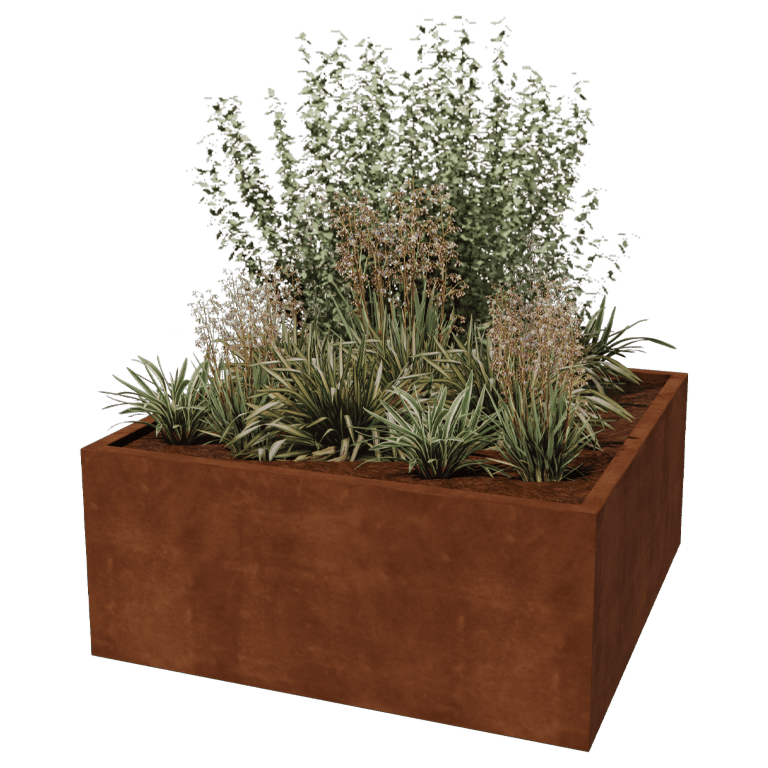 Nämä kasvilaatikot valmistetaan korkealaatuisesta Corten-A teräksestä. Tällä metallityypillä on ainutlaatuinen ominaisuus, että se muodostaa erittäin tiheän oksidikerroksen (ruostekerros) pinnalleen. Ruostuminen on näin ollen mahdotonta. Tiheä oksidikerros suojaa syvemmällä olevaa materiaalia hapelta, mikä hidastaa oksidaatiota merkittävästi samalla kun korroosio jatkuu. Corten-teräksinen kasvilaatikko toimitetaan ruostumattomana, harmaan metallivärisenä. Ruostumisprosessi alkaa ensimmäisten kahden kuukauden aikana, eikä siihen tarvita erityistä käsittelyä. Ruostumisprosessin aikana kasvilaatikko voi päästää väriä. Corten-teräs on metalliseos, joka koostuu raudasta, johon on lisätty kuparia, fosforia, piitä, nikkeliä ja kromia.