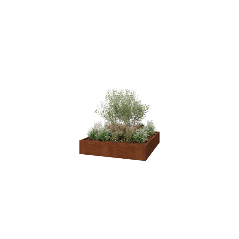 Nämä kasvilaatikot valmistetaan korkealaatuisesta Corten-A teräksestä. Tämä metalliseos muodostaa ainutlaatuisen tiheän oksidikerroksen (ruostekerros) pinnalleen. Täten läpi ruostuminen on mahdotonta. Tiheä oksidikerros suojaa syvemmällä olevaa materiaalia hapelta, mikä hidastaa oksidaatiota merkittävästi vaikka korroosio jatkuu. Corten-teräksinen kasvilaatikko toimitetaan ruostumattomana, harmaan metallivärisenä. Ruostumisprosessi alkaa ensimmäisten kahden kuukauden aikana, eikä siihen tarvita erityistä käsittelyä. Ruostumisprosessin aikana kasvilaatikko voi päästää väriä. Corten-teräs on metalliseos, joka koostuu raudasta, johon on lisätty kuparia, fosforia, piitä, nikkeliä ja kromia.
