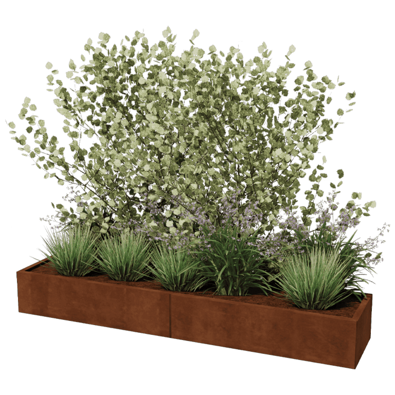 Modulaaristen kasvilavojemme paneelit valmistetaan korkealaatuisesta Corten-A teräksestä. Tällä metallityypillä on ainutlaatuinen ominaisuus, että se muodostaa erittäin tiheän oksidikerroksen (ruostekerros) pinnalleen. Ruostuminen on näin ollen mahdotonta. Tiheä oksidikerros suojaa syvemmällä olevaa materiaalia hapelta, mikä hidastaa oksidaatiota merkittävästi, vaikka korroosio jatkuu. Corten-teräksinen kasvilava toimitetaan ruostumattomana, harmaan metallivärisenä. Ruostumisprosessi alkaa viikkojen tai 2 kuukauden kuluttua, eikä käsittelyä tarvita. Ruostumisprosessin aikana kasvilava saattaa vuotaa väriä. Corten-teräs on metalliseos, joka koostuu raudasta, johon on lisätty kuparia, fosforia, piitä, nikkeliä ja kromia.
