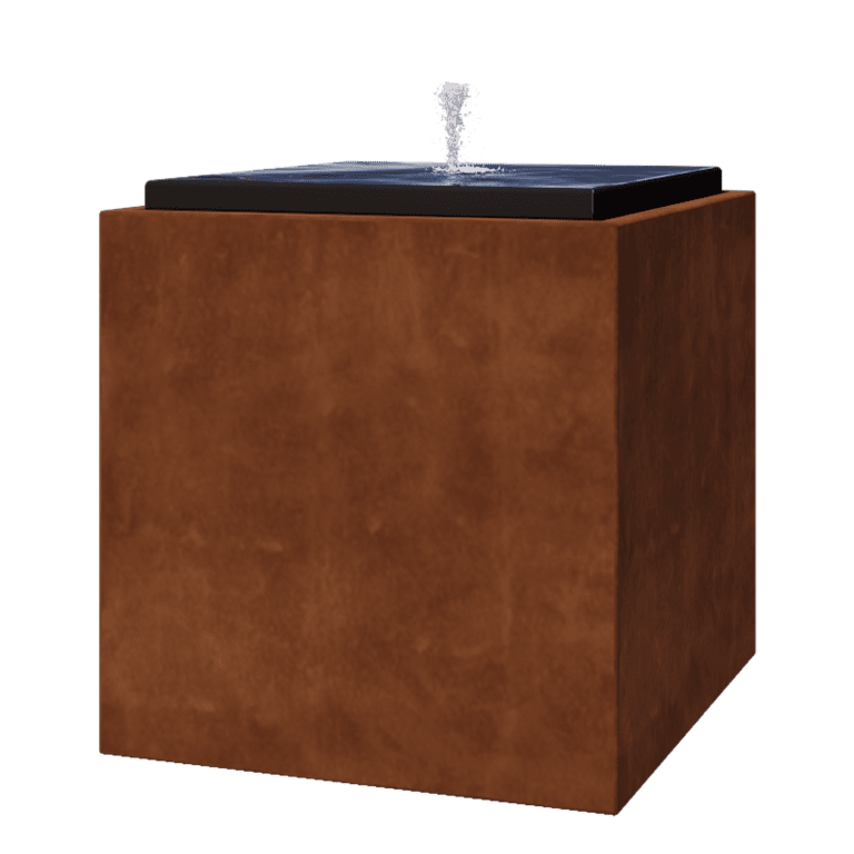 Vesielementti toimitetaan täydellisenä mukana tulevalla pumpulla ja johdolla. Altaassa oleva pumppu nostaa vettä ylöspäin, minkä jälkeen vesi valuu sisälevyn yli ja palaa takaisin altaaseen. Corten-teräksisestä vesielementistä sinun tulee vaihtaa vesi ensimmäisten kuukausien aikana, kunnes ruostuminen on tapahtunut kokonaan. Pakkanen vaatii pumpun sammuttamista. Lisäoptiona voit valita LED-valaistuksen.